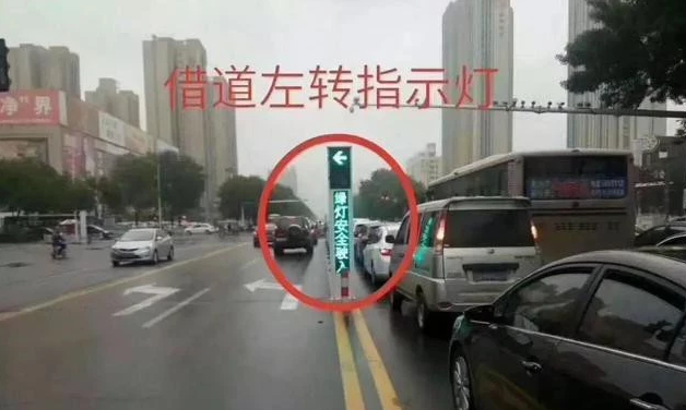 设置了“借道左转”车道的路口,一般会在距离路口停止线60米左右处设置“借道左转”信号灯,有的在道中间,有的在上方指示牌里,当信号灯变成绿色时,大家才可以驶入左转待转车道,等待大路口左转绿灯亮起后,再依次通过路口。
