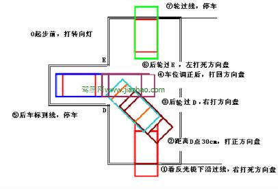 1、轻抬离合使车后移,控制好车速,看左后视镜,当右起点感应线出现在左后视镜位置时把转向盘右打死。