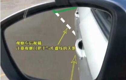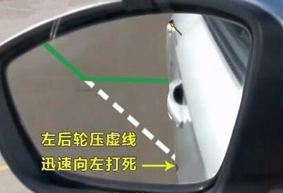 四、回正方向缓慢向后倒,观察左后视镜,当左后轮压虚线时,迅速向左打死。