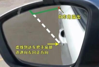 三、观察左后视镜,看车把手到库边虚线,再看D库角露出回正方向。