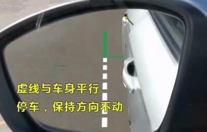 五、保持方向不动缓慢向后倒,观察虚线与车身的关系,当车身与虚线平行时,停车,保持方向盘不动。