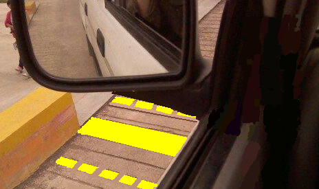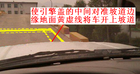 1、看点一:使引擎盖的正中间对准坡道边的黄色虚线,将车辆开上斜坡,此时,右车轮压虚线而上,如图1所示。(可以在上坡过程中,用眼睛的余光瞥一眼右后视镜,看看是不是压着黄色虚线上去的)