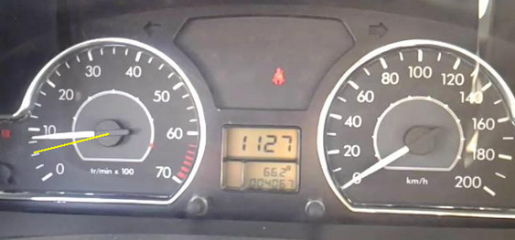 3、看点三:在缓慢抬起离合器的同时,注意观察仪表盘上的发动机转速表,当转速下降约一小格,同时,发动机声音变沉闷、车头略有上翘时,稳住离合不动,缓抬刹车,车辆将会起步,如图3所示。起步后,转速又会回到怠速位置。