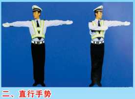 对比:直行信号是交警的左右臂同时与肩平伸,右臂呈摆动动作;变道信号中交警的左臂无任何动作,仅仅是右臂在与肩平齐方向平伸摆动。