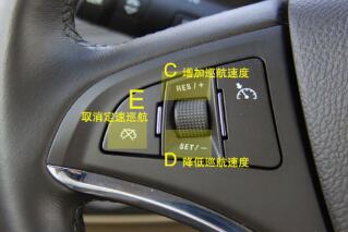定速巡航系统的按键主要有:开关键(ON/OFF)、取消键(CANCEL)、设定当前速度(SET)、恢复设定速度(RES)。加速(+)一般跟RES键一起,减速(-)跟SET键一起,定速巡航控制器一般布置在方向盘附近,主要分为控制杆式、方向盘按钮式与方向盘控制组式。