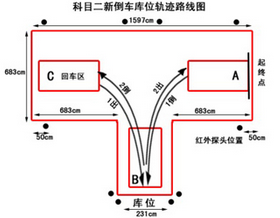 4、首先直线倒退,当看到右后窗窗花和库线重叠时,向右打死方向继续退。
