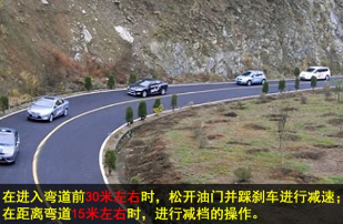 驾驶窍门:在进入弯道前30米左右时,松开油门并踩刹车进行减速;在距离弯道 15米左右时,进行减档的操作。同时应开启转向灯,提醒后车前车即将进入弯道,好让后车也能减速行驶。