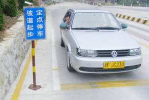 5、车辆距离坡道停车起步线越来越近时,要踩住离合器和刹车降低车速,离停车线有20--30公分处就要停稳车了。踩住刹车的同时拉紧手刹,如果摘了档(即车辆档位处于空挡位置)可以不用踩离合器了。这样坡道停车基本完成。