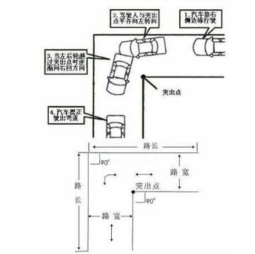 注意要调整右后视镜位置,尽量压低,能侧身看到右后胎为好;车子即将进入直角弯时尽量放慢速度;左雨刷器支点贴着直角弯左线前行,这个点根据每个人的位置、身材不同,会有差异,主要是为了保证左轮胎与直角弯左线的距离在15~20公分,并且保证车身正。