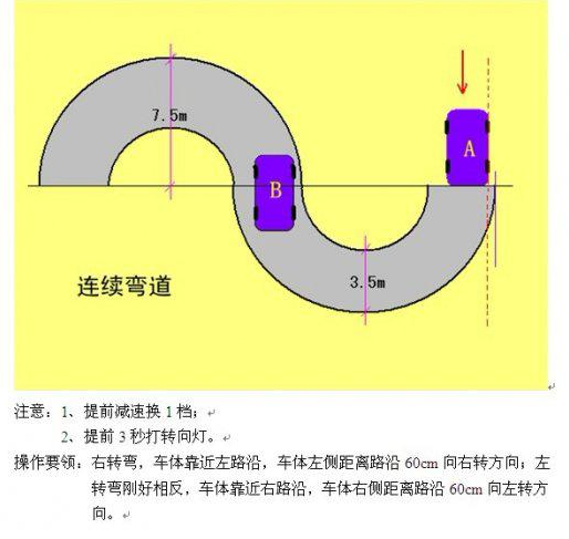 为一条存在两个大于40度角转弯的车道,需一次性开过,中途不能停车和压线、出线。