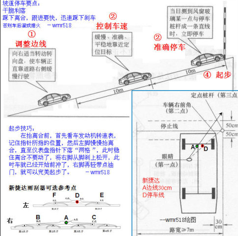 窍门:开车至坡起考点可借辨认前挡玻璃标志与标线重叠,来决定什么时候停车(教练有教),而起步时注意轻轻松开离合,同时小幅度踩住油门,再松手刹,防止后溜。