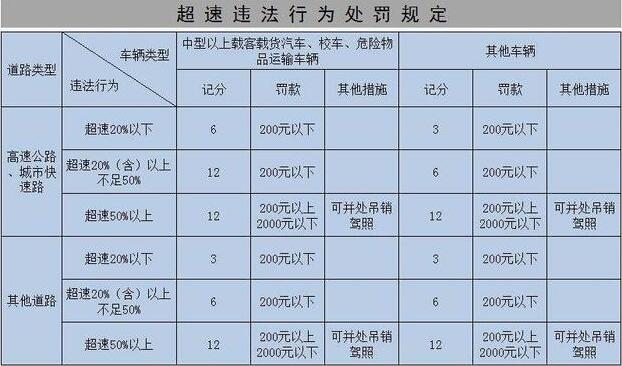 (三)在限速为50公里以上80公里以下的道路,时速超过限定时速10%以上不到20%的,处100元罚款;超过限定时速20%以上不到50%的,处150元罚款;超过限定时速50%以上不到70%的,处500元罚款;超过限定时速70%的,处1000元罚款;