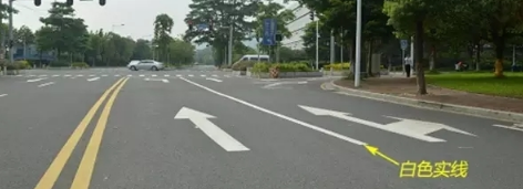 白色实线通常会出现在路口的交通灯前,它的作用就是分隔同向并排车道,将车流引导到相应的行驶路线。