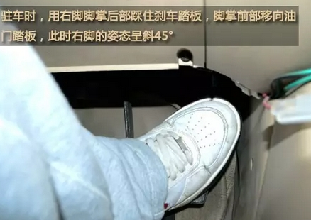 4、右脚尽量踩住刹车踏板的前端,并且踩刹车踏板的力度要大于踩油门踏板,避免制动力不足造成溜车。