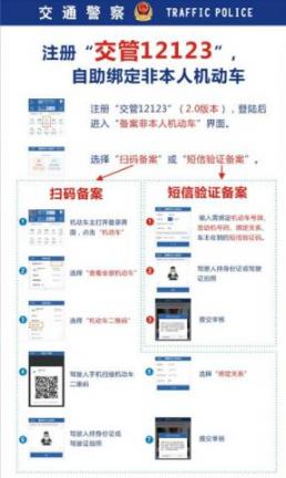 下载“交管12123”的APP,然后用身份证进行个人用户注册。其次,选择“机动车”进入绑定车辆页面,选择“非本人机动车”,然后提交相应的资料信息(按照步骤操作即可)。最后,提交资料后则需进行审核,审核通过后,系统自动将审核结果通过短信、交管12123手机APP告知申请用户。