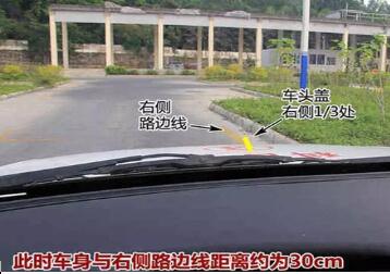 2、靠库:打右转向灯,让车头盖右侧1/3的位置压库边线,即可保持车身与库边线有30cm左右距离。