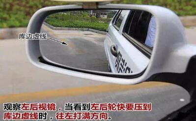 然后观察左后轮,等到左后轮即将压到库边虚线时,往左打满方向,同时观察车身左右两侧库边线的角度,调整回方向的速度。