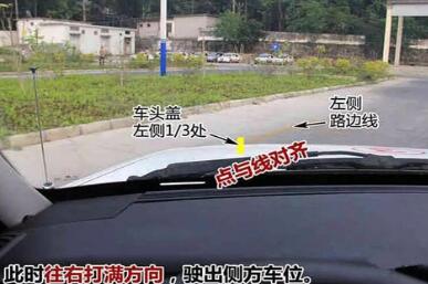 6、挂1挡,打左转向灯,直接起步,当看到左车角碰到左侧边线时,回正方向,等车头盖左侧1/3处碰到左侧边线时,往右打一圈方向,让车辆绕过库角驶出车位,等车身与路的方向平行时,往左回正方向,驶出侧方停车考试区域。