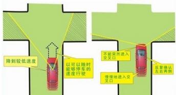 4、距路口30m左右时,根据现行车速换挡,同时按着左中右的顺序观察路口内情况。