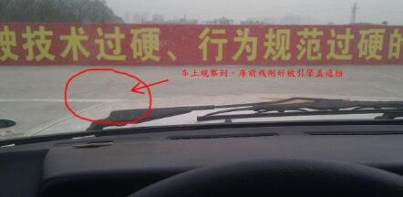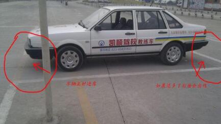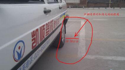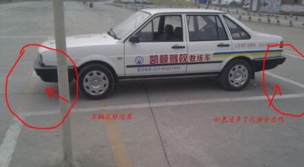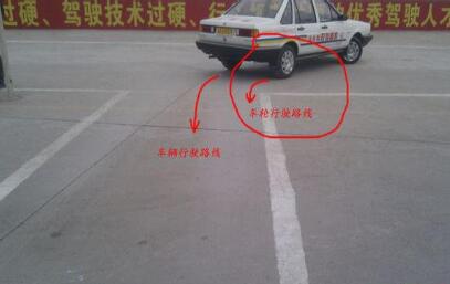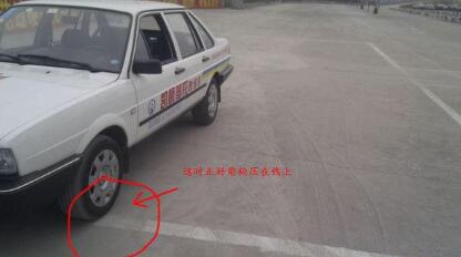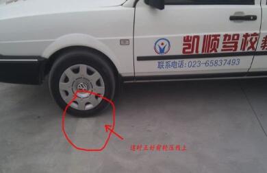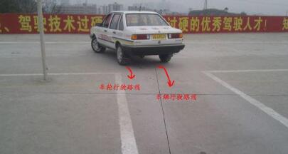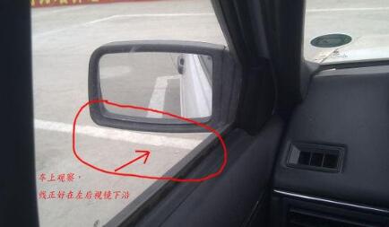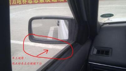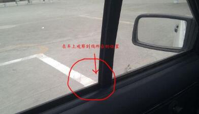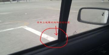在车上观察,线到左窗立柱时停车,正好车轮压线