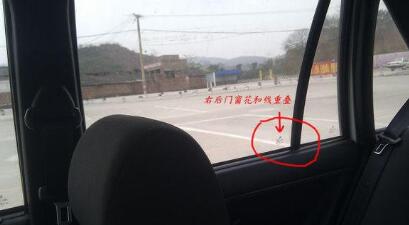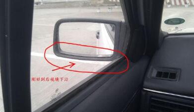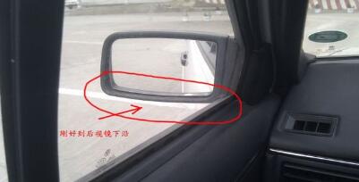 直退时刚好看到线在左后视镜下沿,也可以看右后窗窗花和库线重叠(两点任选一点看)