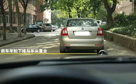 当轿车车头边缘与前车保险杠下缘重合,此时与前车的距离大概是3米。