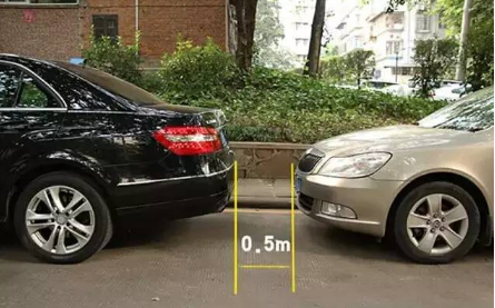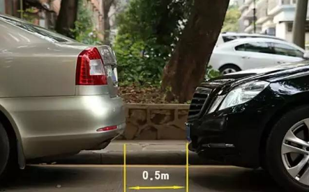 当轿车车头边缘与前车车牌下缘重合,此时与前车的距离大概是0.5米。这时候就两车的距离就是比较合适,可以拉起手刹停车了。