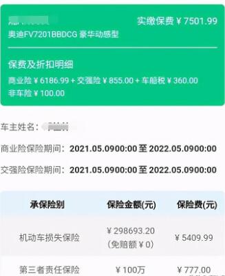 车损险保额29.8万,保费5409元;第三者责任险保额100万,保费777元;交强险855元;车船税360元,另外买了一份保额5万的驾乘意外险,100元。