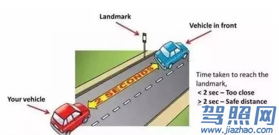 “2秒法则”的具体方法如下:在跟车状态下,驾驶员以路面或路边的某个固定物为参照,前车开过这个参照物后,心中默数2秒。如果数完后,你还没有驶过这个参照物,说明你保留了足够的安全距离。相反,还没数完就驶过参照物,说明你留的距离不够长。在下雨天、大雾天则要改为3秒、4秒,为保证能及时制动。可能大家看文字不一定能具体了解,可以看下图。