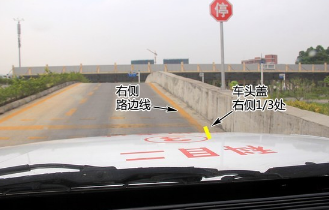 1. 行驶中初步摆正车身左右位置打右方向灯进入考试,像靠边停车一样,用车头右铆钉投射点触碰车道右边线(右边线约切进车头三分之一,即55cm)。