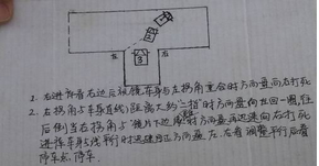 ①车速慢,车身尽量靠外侧边线30公分,向前探身,当看到门内扣手与拐角线重合时,迅速立刻打死方向,车头和后轮均不会扫线,准确率百分百!
