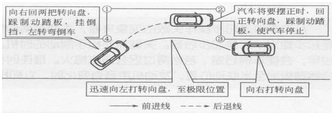 ②当右后视镜看不到库左上角时(此时说明,右后轮与库左上角基本平齐),向右打死方向,车体不会压库角。