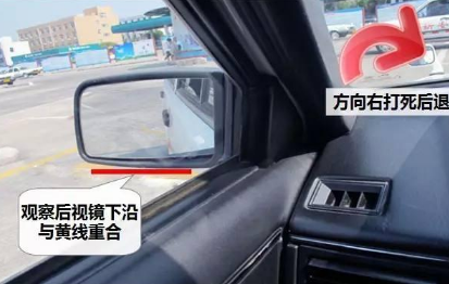 2、倒库,在这里以右倒车入库为例,倒车入库开始,待左后视镜与停止线平齐或者盖住就立马打方向盘,一般宜早不宜晚,直接打死方向盘;