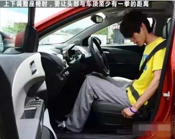 上下调整座椅让头部离车顶部至少还有一个拳头的距离,座椅调得太高,车辆颠簸时头部易触到车顶,影响行车。