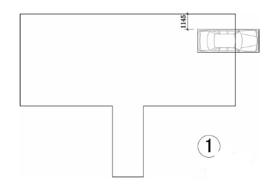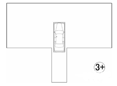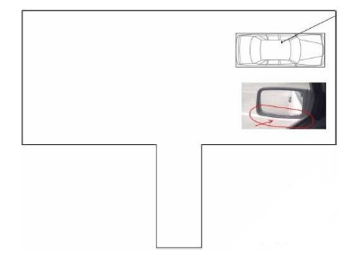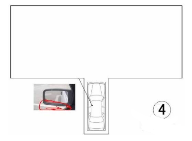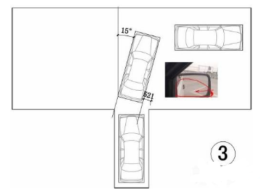 当车开到如图位置:车身偏斜15度左右,从右反光镜看车身与车库线距离如图,可以辨别车可以进入车库,方向不变,继续倒车。
