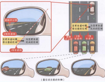 如果后车处在你准备变道的车道内,此时要格外当心。也就是说,当后视镜的黄色区域内有车辆行驶的话,变更车道时要多加留意,而在后视镜灰色区域内行驶的车辆则对变更车道没有什么影响。其中,最应该留意的是1号车道线和2号车道线之间的车辆,因为它就位于你旁边的临线车道内。