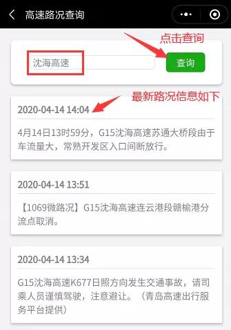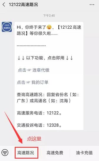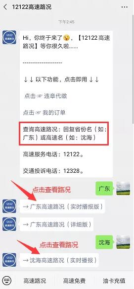 关注成功后,直接底部菜单回复:省份名或高速名,即可获取当前高速最新路况实时播报以及封路信息播报,比如输入广东或沈海,如下图: