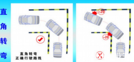 直角转弯的操作要领是(以由右向左转弯为例)进入直角转弯区,要使车辆右侧与路边线保持在30厘米的距离(此距离非常关键,若距离过近容易造成车右侧轧线,若距离过远,不能有效地利用路面的宽度,则造成操作失败)直线前进,保持正确的驾驶姿势,当视线所观察到的车辆的最前端与前路边线重合时,便可迅速将方向盘向左转到底,等到车身完全转过,车头正直后迅速将方向回正,直角转弯结束。