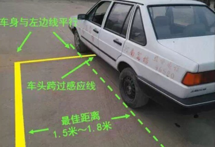 这里以右侧倒库为例,首先我们把车停在右起点线以外,这时车身与左边线距离恰巧在最佳距离以内,这样能保证后面的入库不会轧线。