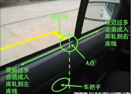 开始缓慢倒车,向左扭头,观察左车窗外感应线的位置,当感应线与车窗下沿的交点到达A点时,向右打死方向盘。