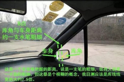 保持方向盘右打死,继续倒车,同时观察右后视镜,这个过程镜中的状态是这样变化的:看不到库角→看到库角→库角与车身的距离逐渐缩小,库角也从上到下不断下沉。