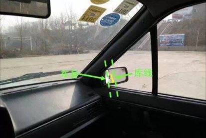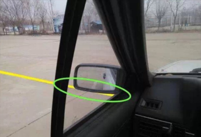 继续缓慢倒车,迅速扭头观察左后视镜,当左后视镜下沿刚好盖住左出库线时,踩刹车,停住。