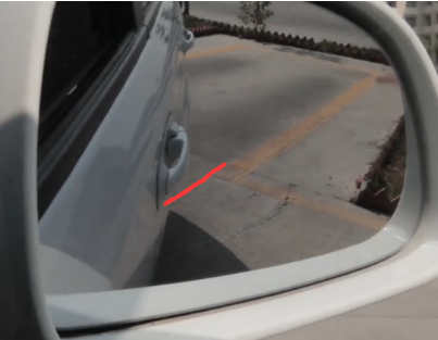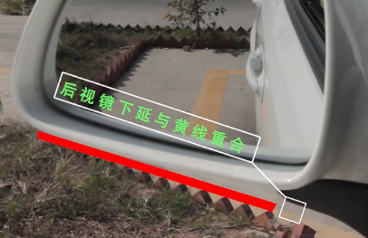 第四个点:当左侧后视镜下沿与前面黄线重合的时候,停车。