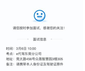 也就一两天的时间,e代驾发过来一条短信息,说初试资料通过,要面试,带驾照,身份证,按照给的时间地点来面试!