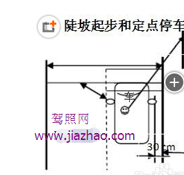 2.即将到达路边时,方向向左回小半圈,再迅速向右回正,使车右侧与路边保持平行,并距离在30CM内(保持左雨刷中部连接部件(黑色方块)在白色线与黄色线之间,不能压黄色线;最好压白色虚线走.或用左筋对准标志线走);起步后,可完全放开离合(或用离合控制,车速快一点,不易熄火)进行上坡(上坡过程中,如果车出现明显抖动,可踩一点离合,可保持不熄火)。