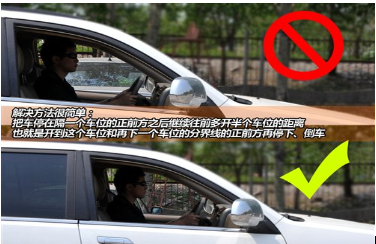 例如更大一点的哈弗车,按照刚才的初始位置就不合适。所以,可以适当改变一下,解决办法就是把车停在隔一个车位的正前方之后继续往前多开半个车位的距离,也就是开到隔一个车位和隔两个车位间的分界线时停下。这样就刚刚好。