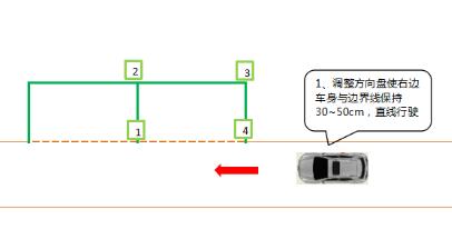 进入侧方位停车考试区域后,左右调整方向盘使右边车身与边界线保持30~50cm,直线行驶。