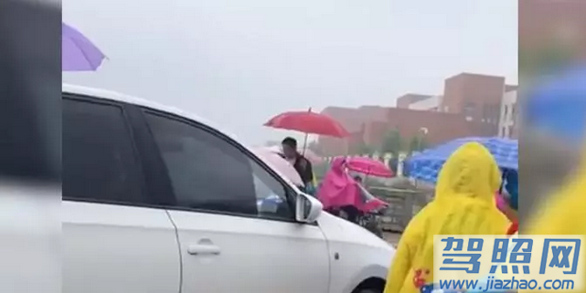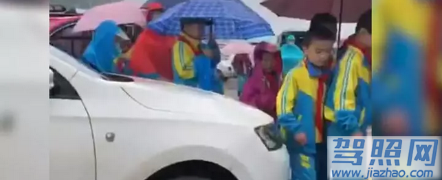 2018年9月18日下午,山东菏泽一学校门口,天正下着雨,一辆鲁R15×××白色小轿车在此路过,驾驶人不但没有礼让过往学生,反而硬是用车头抵着孩子们的腿,生生蹭出了一条路。