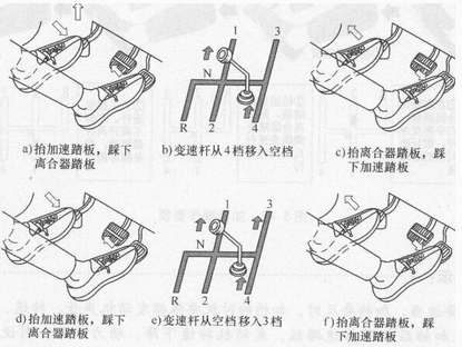 两脚离合器换挡法,其实比着一脚离合器换挡的方法在操作流程上多出来几步:加挡时,按照“踩(离合器)、摘(空挡)、踩(离合器)、挂(高速挡)”的操作顺序,快速踩两脚离合器踏板,可以很轻松地增加挡位;减挡时,按照“踩(离合器)、摘(空挡)、抬(离合器)、轰(油门)、踩(离合器)、挂(低速挡)”的操作顺序,同样是踩两脚离合器,在第一脚踩离合器后轰一脚空油,再在踩第二脚离合器的同时换到低速挡。