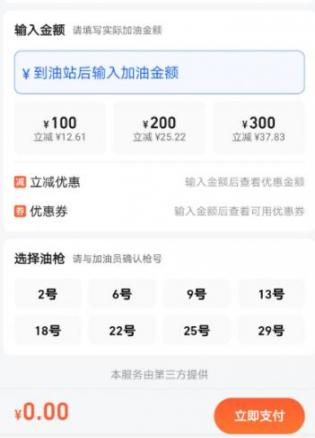 上图显示,可以看出当前加100元的油立减12.61元,200元立减25.22元,300元立减37.83元,其实还是很优惠的,我上午8:29加了100元的油,问服务员说是9号油枪,那时加了100元的油,实际支付才89.55元,一共优惠了10.45元。当然这些优惠是不断更新变动的。